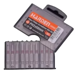 סט ביטים מקצועי PH2 באורך 50 מ"מ מבית HARDEN, כולל 10 יחידות איכותיות באריזת פלסטיק קשיחה עם תלייה.