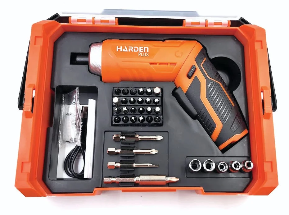 מברגה חשמלית קומפקטית ואיכותית מבית HARDEN PLUS, כוללת סט של 18 חלקים מתחלפים – אידיאלית להרכבות בבית, במשרד ובשטח.